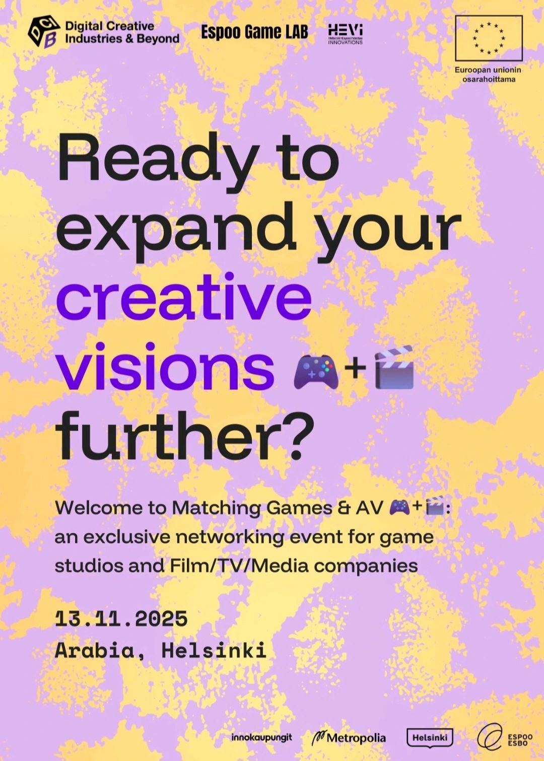 Digital Creative Industries and Beyond (DCIB) project, Espoo Game Lab and HEVinnovations are on a mission to bring together Finland’s most forward-looking AV production companies and game studios for an exclusive networking event.